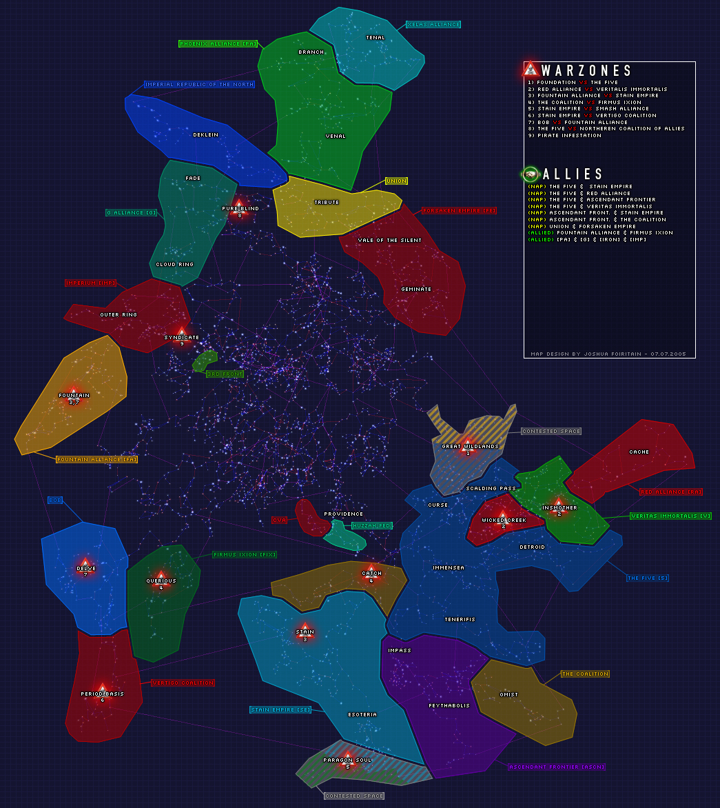 Originally by: Joshua Foiritain Edited by: Joshua Foiritain on 09/07/2005 11:28:13 The original: Linkage The edited version with less transparency which i didnt like to much: Linkage The newest version with slightly diffrent colors in an attempt to give each alliance its own color and bigger font for the alliances: Linkage