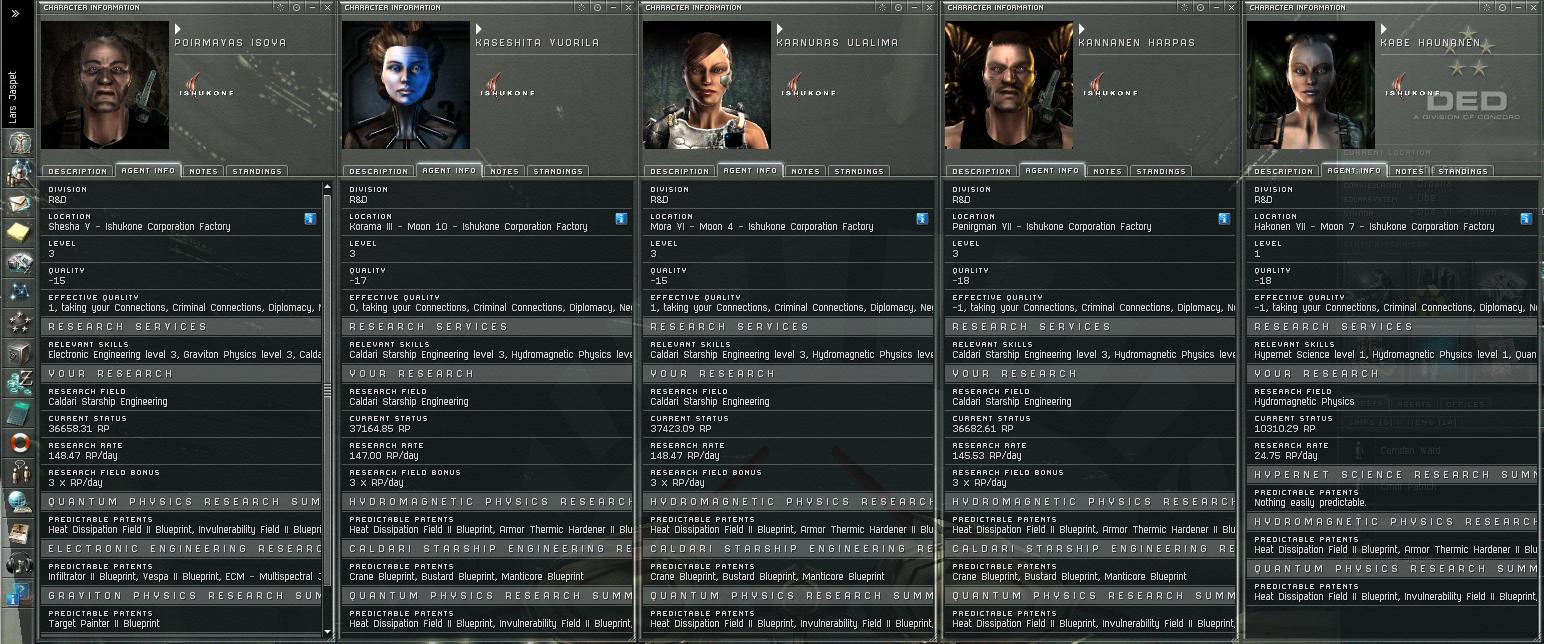 Agents: Lars has 5 research agents, and I'll be honest, I never spent any time doing missions, so they are all lvl 3 agents with an effective quality of -1, 0, or +1. Take a look at the next link, it will show that lars has over 150,000 research points built up. I got a T2 bpo from him more than a year ago, so he's due to throw one out any time now!Lars' Agents
