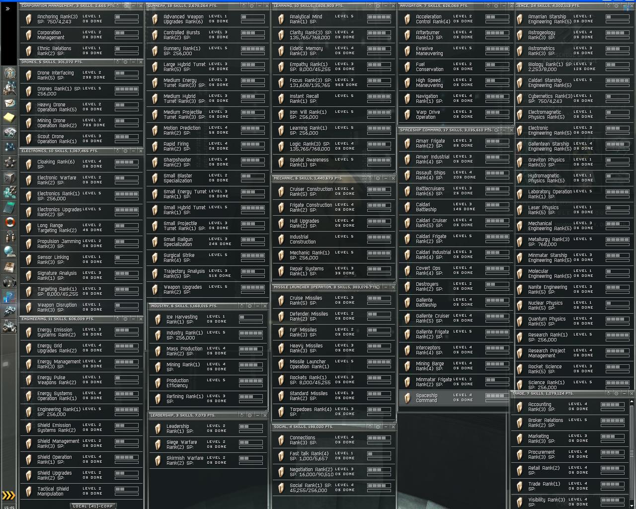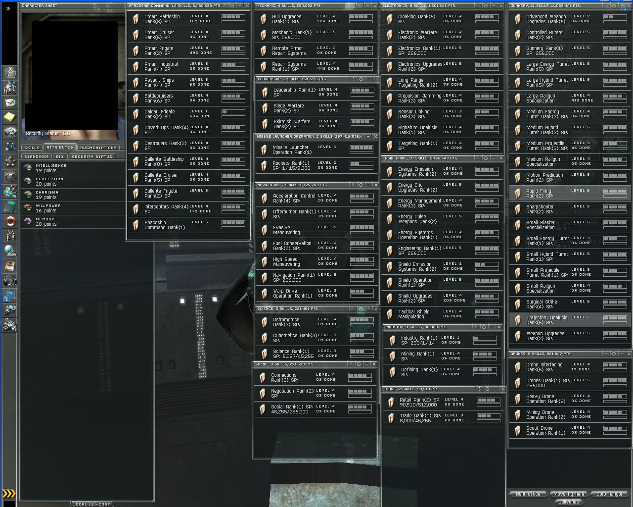2) 18+ Mill Sp PvP/R&D, CEO of itŠs own corp, no members, purely done for the building of ships...can build T2 ships and items...150.000+ RP all in all with 5 R&D agents... Skills Attributes Augmentation(Implants)