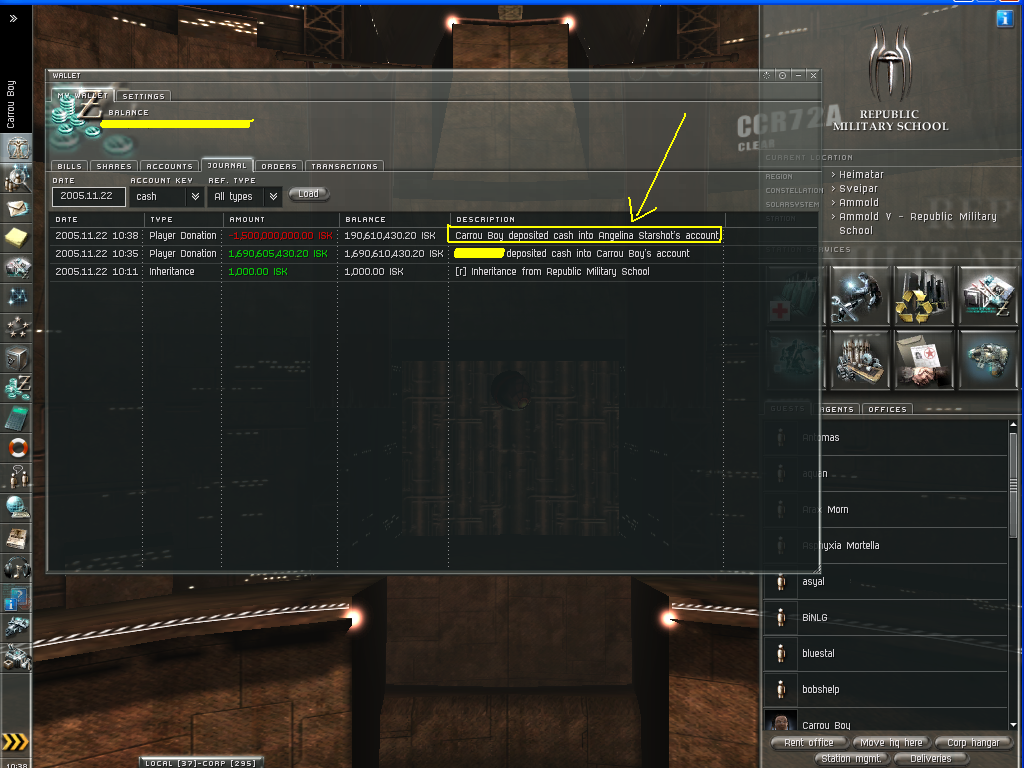 i was banned on the alt that angelina sent the time codes to, i did not recive them because i cannot sign onto the account, i asked her nicly to send the same codes to this character and she told me to show proof, ive given proof by changing the file name of the original transfer of cash screen shot and re-hosted it so that it shows as a different URL to proove that carrou boy was me. she still refused to send me the timecodes in witch i gave her the 1.5b (1500000000) isk for. so there for.. i consider this a scam, and i want my money returned or i want CCP to reopen the account of mine so that i am able to access the codes.