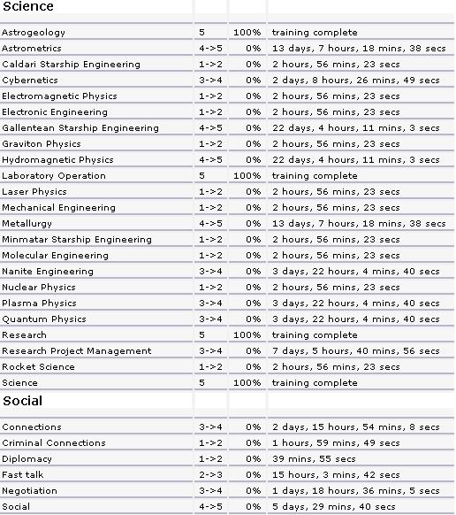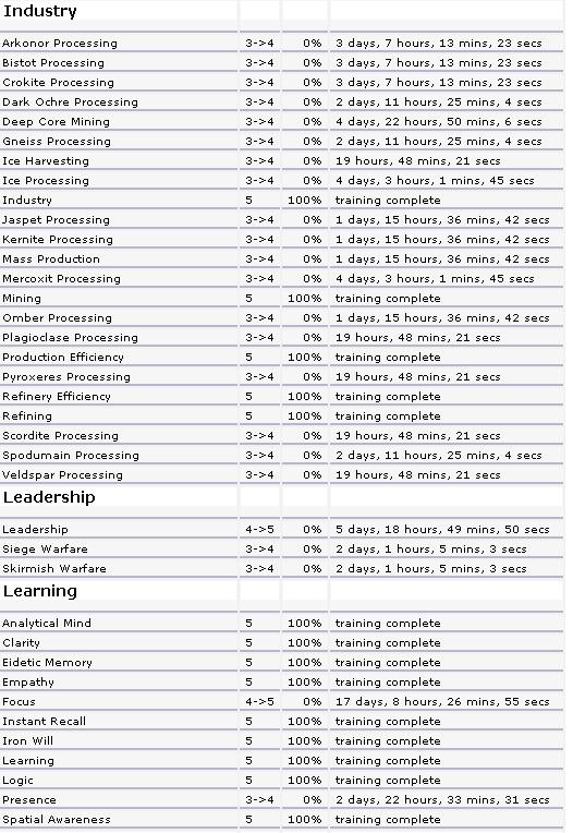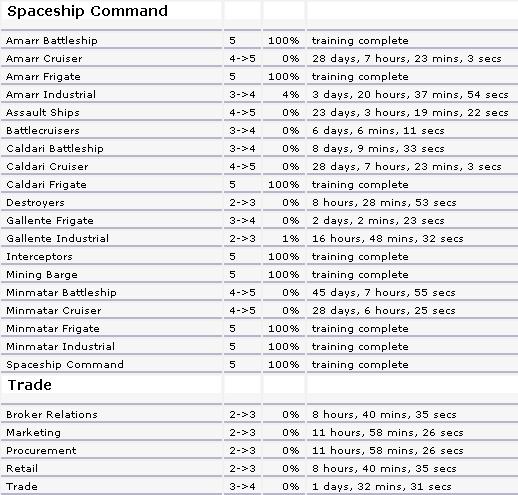 Some Highlights: Amarr BS lvl 5 Interceptors lvl 5 Can fly big Mining Barges (Covetor) Good Refining Skills T2 Large Lasers Minmatar Industrial lvl 5