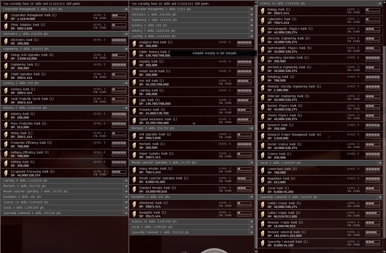 Skill highlights: Industry: Refining 5, Refinery Efficiency 5, Production Efficiency 5, Mass Production 5 Science: Research Project Management 5, Minmatar Starship Engineering 5