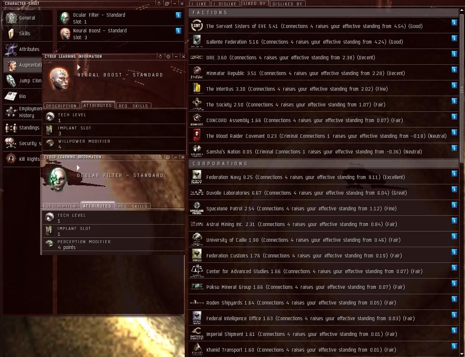 Screenshots. General Info Skills 1 Skills 2 Implants and Standings
